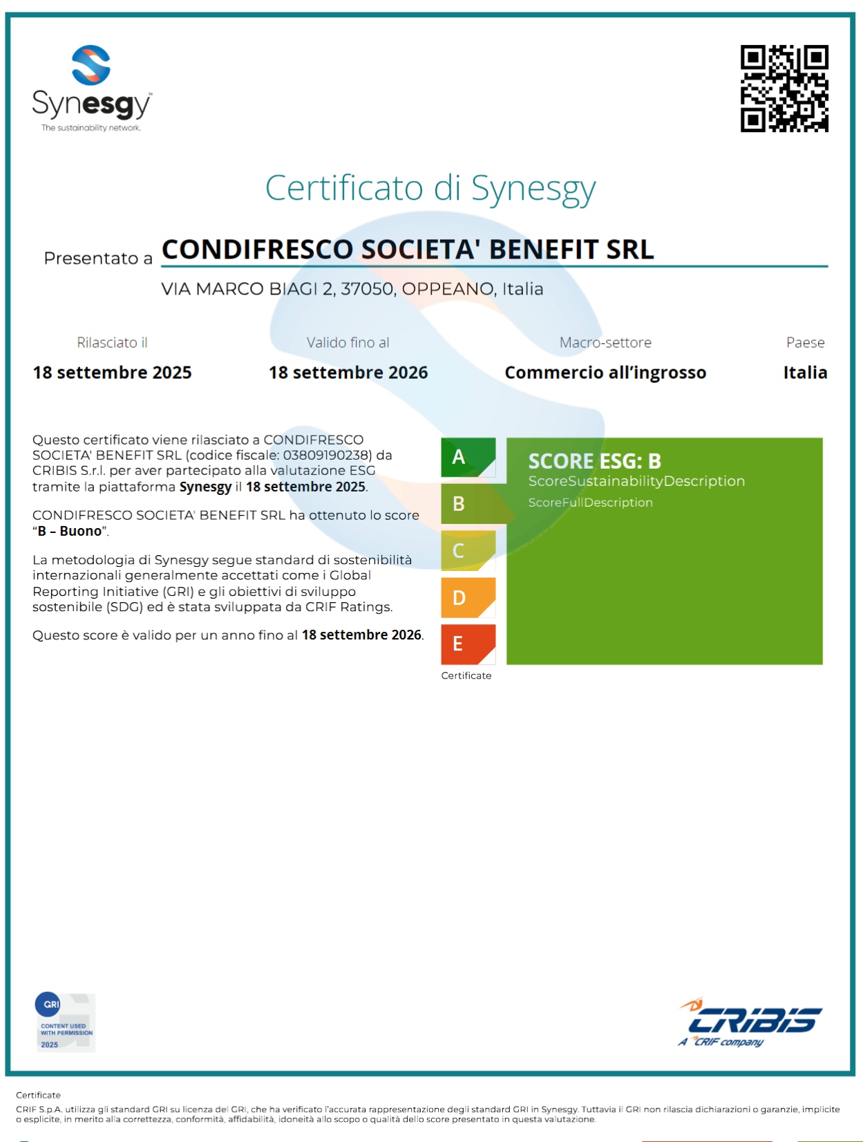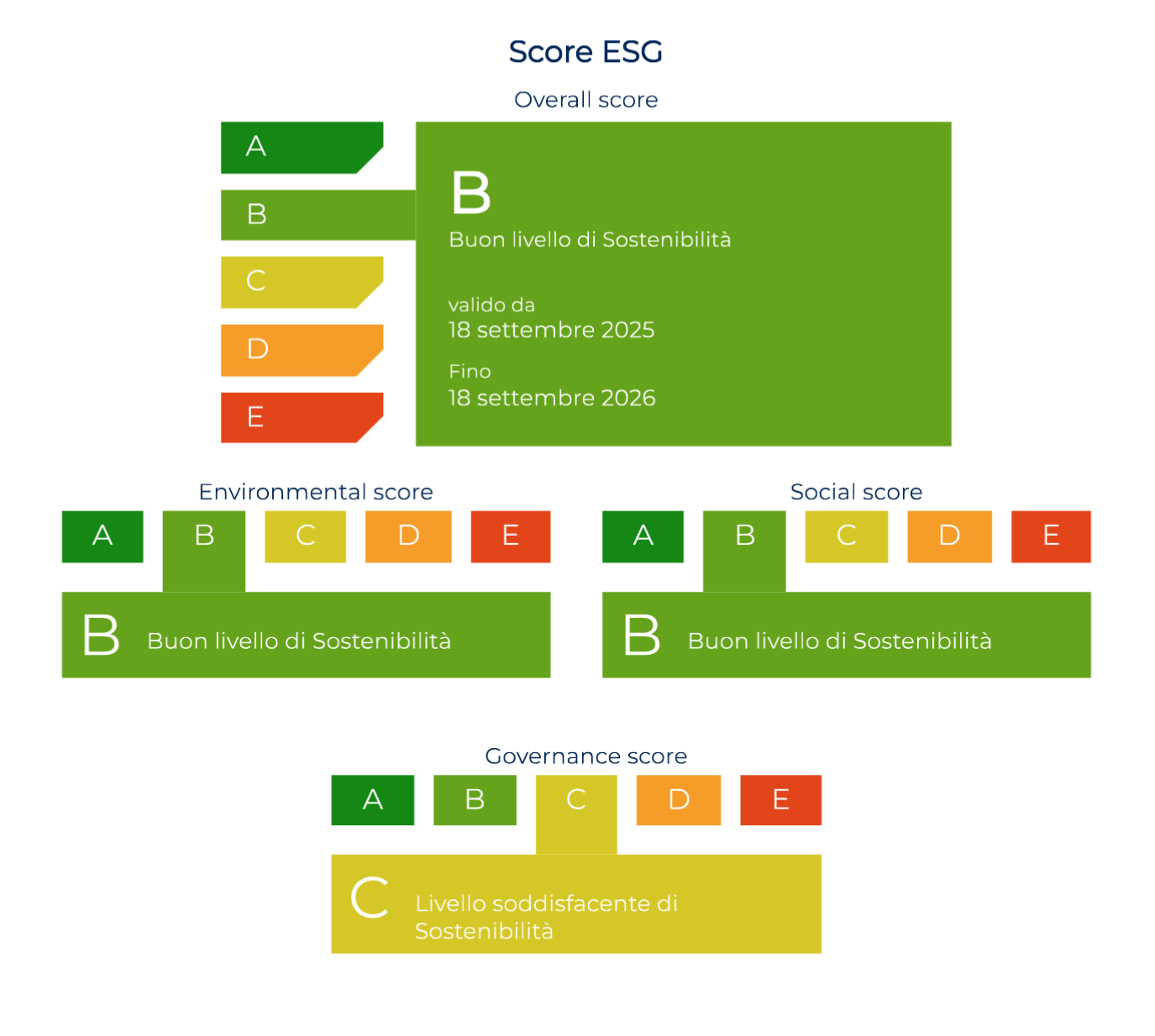 Attraverso Synesgy abbiamo eseguito un self-assessment per valutare il nostro livello di sostenibilità e abbiamo quindi individuato i punti di forza e margini di miglioramento su cui ci impegniamo ad intervenire per puntare al massimo sempre.